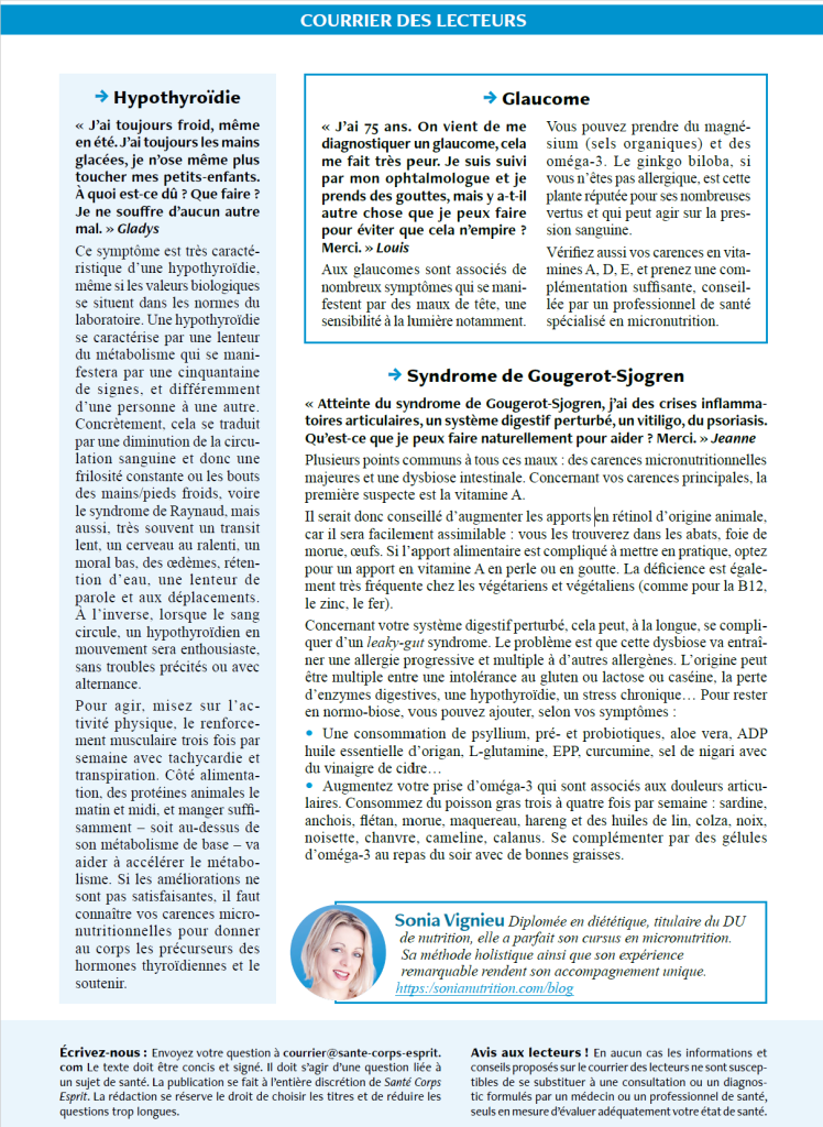 Voici sur cette page quelques extraits des réponses apportées par Sonia Vignieu, micronutritionniste diplômée de la faculté de médecine de Paris, aux abonnés de la revue scientifique Santé Corps Esprit dans la rubrique qui leur est consacrée : le Courrier des Lecteurs.